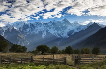 南迦巴瓦雪峰下的村落,在朝阳的晨光里,木栅栏,青稞田还有桃树林,都如此宁静,一片田园风光