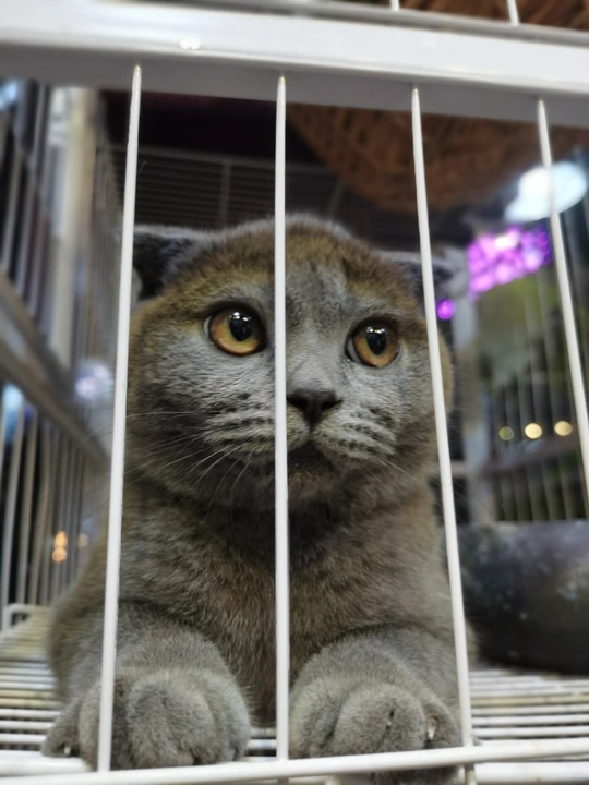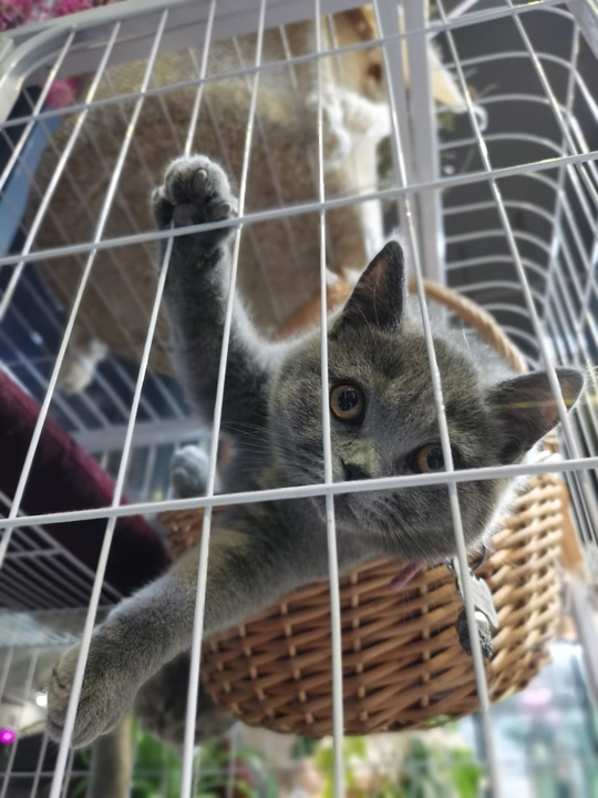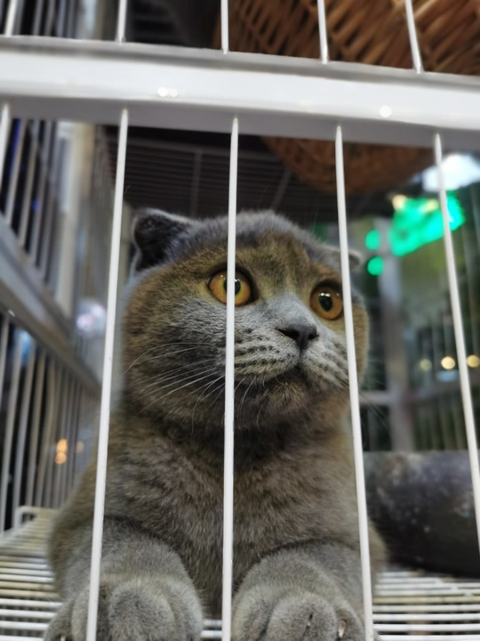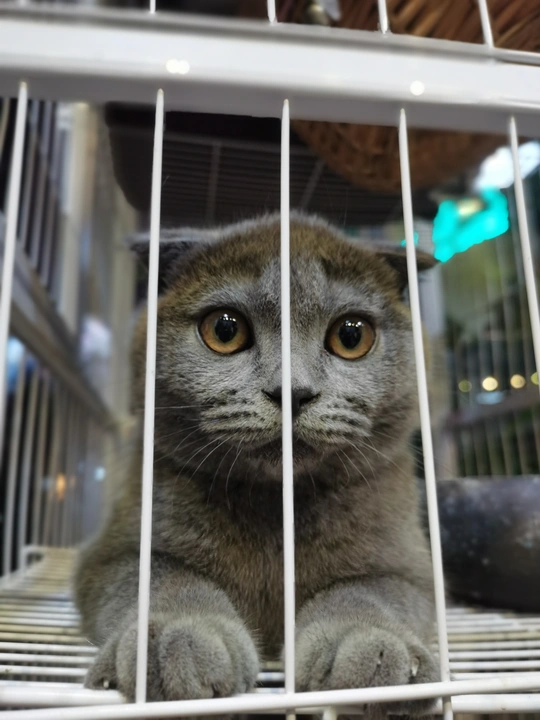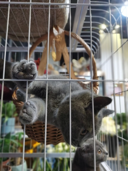 与好友路过一个花店?,她在选花我刚好看到这两只可爱的毛孩子在笼子里一脸无措看了我一眼,随手拍下了几张照片,无修图原相机拍摄。
