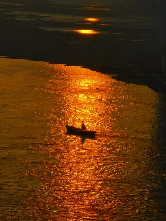 夕阳下的一叶孤舟