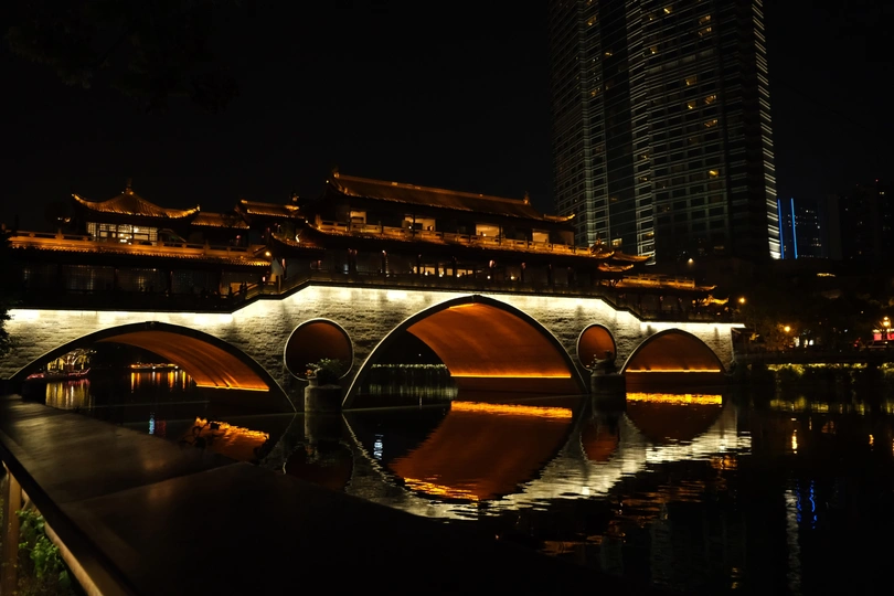 第一次去成都旅游,晚上一个人漫步在府南河旁,看着廊桥亮起了灯,打在河面上,有种壮观的感觉。