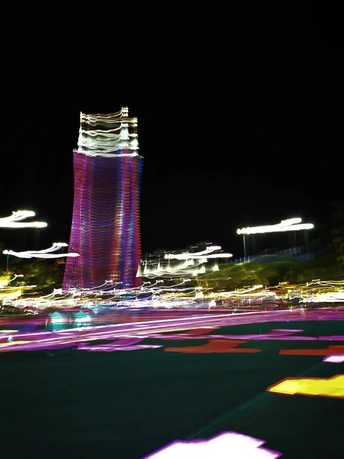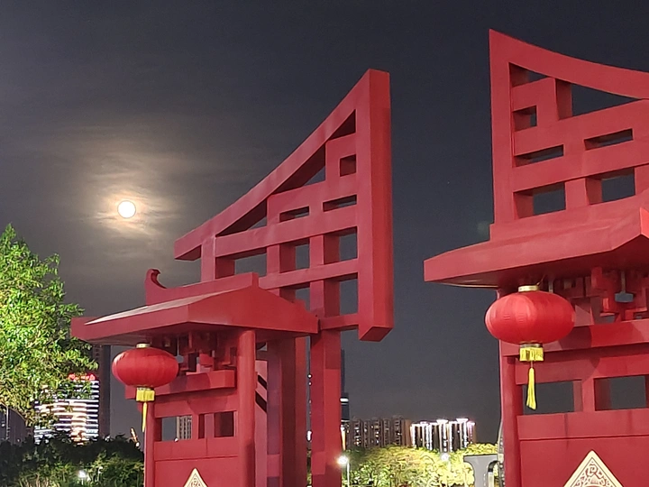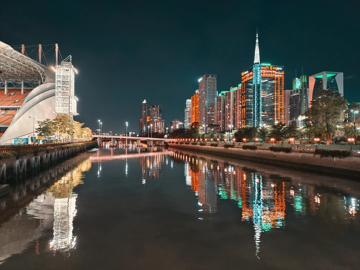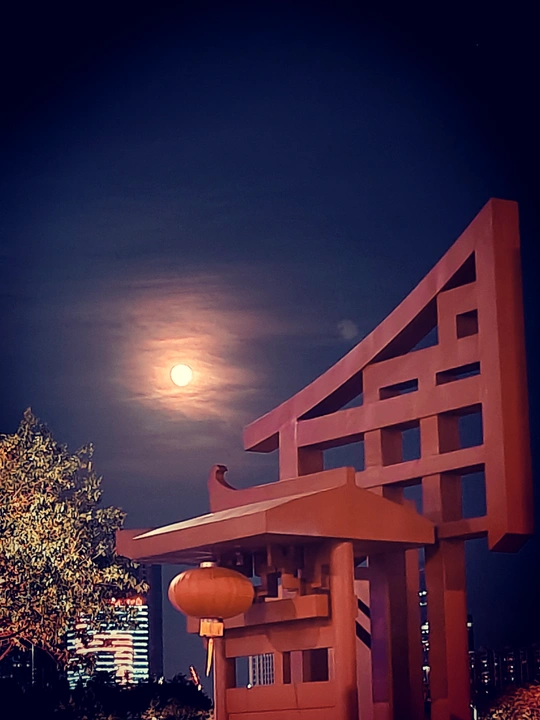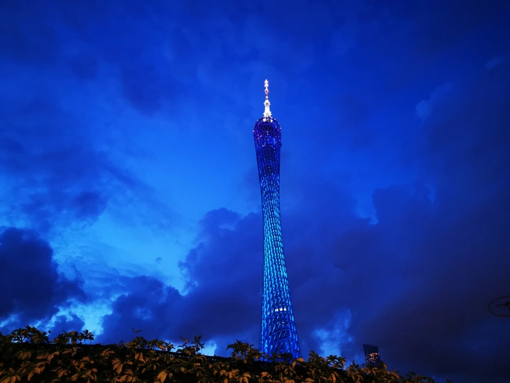 普鲁士蓝的天空 深蓝的广州塔 多云的日夜 圆的月 倒影