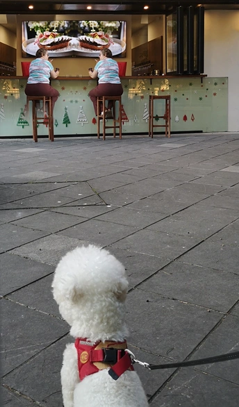 路边小酒吧旁,一只小狗🐶被栓在一旁,一位外籍夫人抽着烟,屏幕里显示着高卡路里的甜品美食,觉得有点意思,手机📱拍摄了下来,后期做简单镜像,形成了这张作品