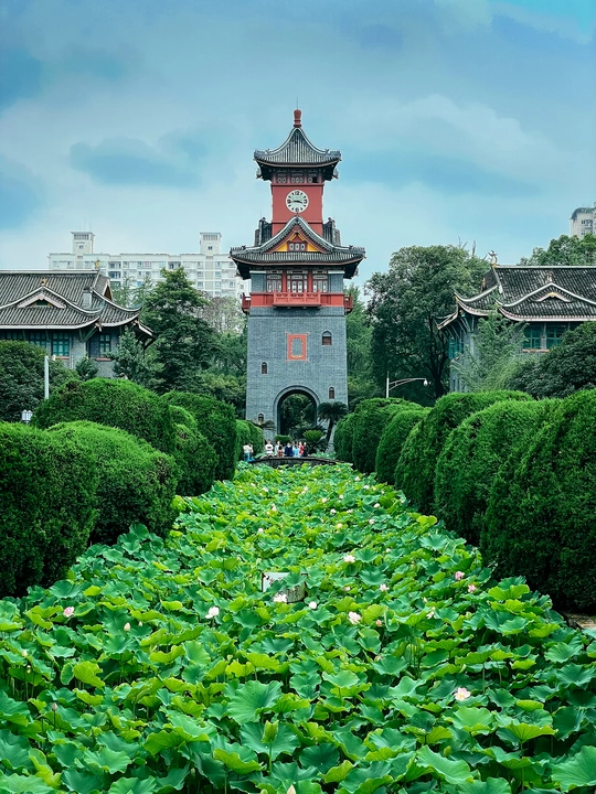 建于1925年的华西钟楼,是华西坝老建筑群中最负盛名的景观,也曾是成都历史上最高的建筑。每年的6月,百年钟楼和碧叶亭亭的荷塘是毕业季学子们最爱的留影地。
