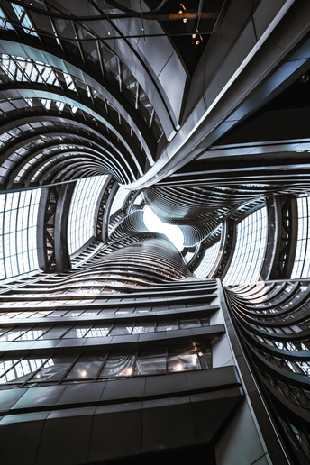 丽泽SOHO内部,设计师将建筑体积分为由一个立面外壳整合起来的两半。中间的空间组成了全世界最高的中庭,高达194.15 米。随着塔楼上升,两半体块相应旋转,直到顶部与北面的丽泽路平行。中庭的旋转让两半体块交织,像动态的双人舞一样。