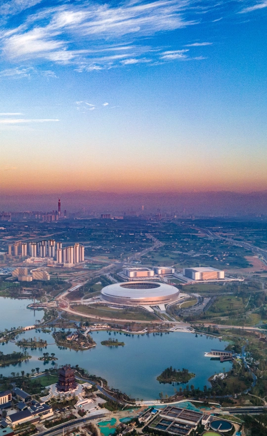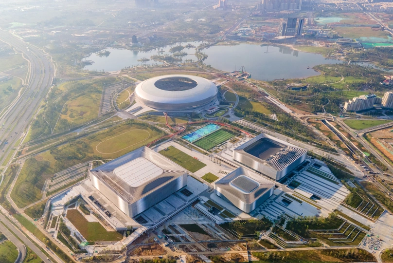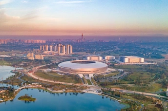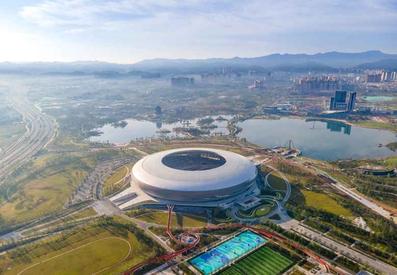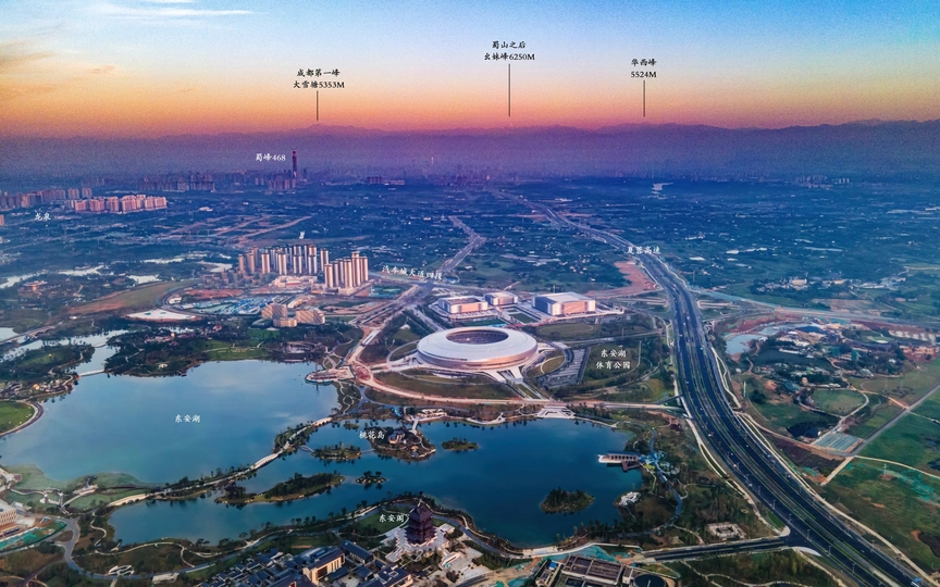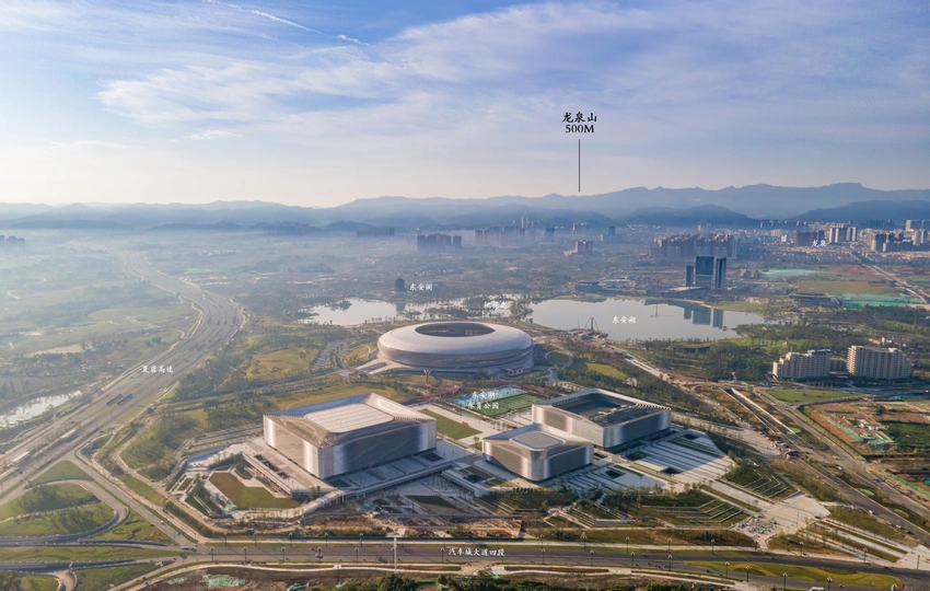 东安湖体育公园位于成都市龙泉驿区车城大道旁,总建筑面积约32万平方米,项目包含“一场三馆一酒店”—4万座的综合运动场、1.8万座的多功能体育馆、5000座的游泳跳水馆和综合小球馆、一座五星级接待酒店。