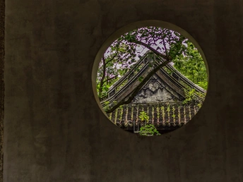 古寺撞钟楼处的墙面上有个大的圆形窗户,透过圆形窗户看见对面的经过岁月的洗礼陈旧墙面和瓦片。