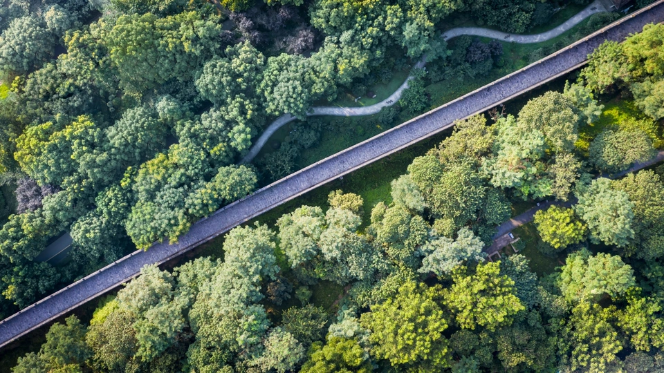 一段笔直静卧在浓绿密林之中的明城墙与身旁蜿蜒的小径形成对比,一刚一柔的线条对比、相映成画,为人做事也应如此才美。