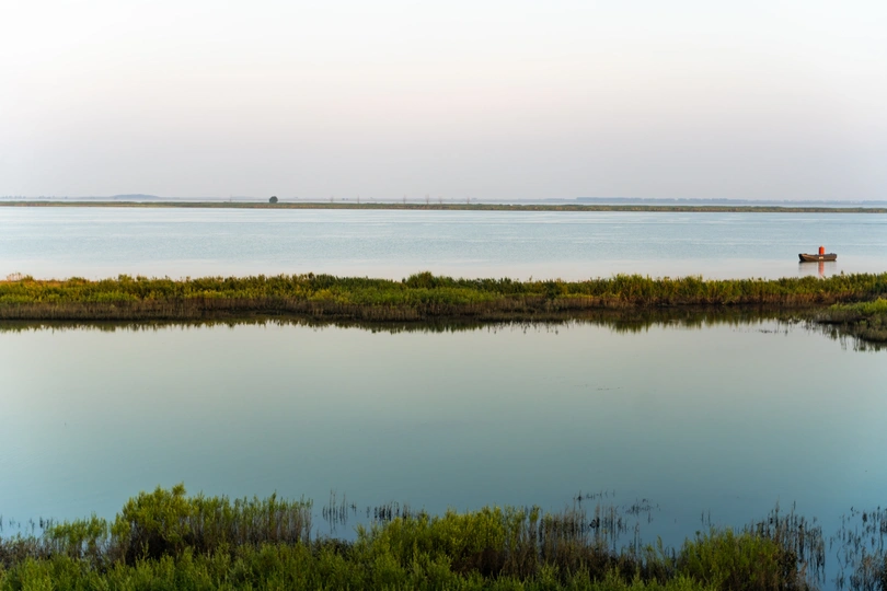 红色的航标船,蓝色的航道,肥美的水草