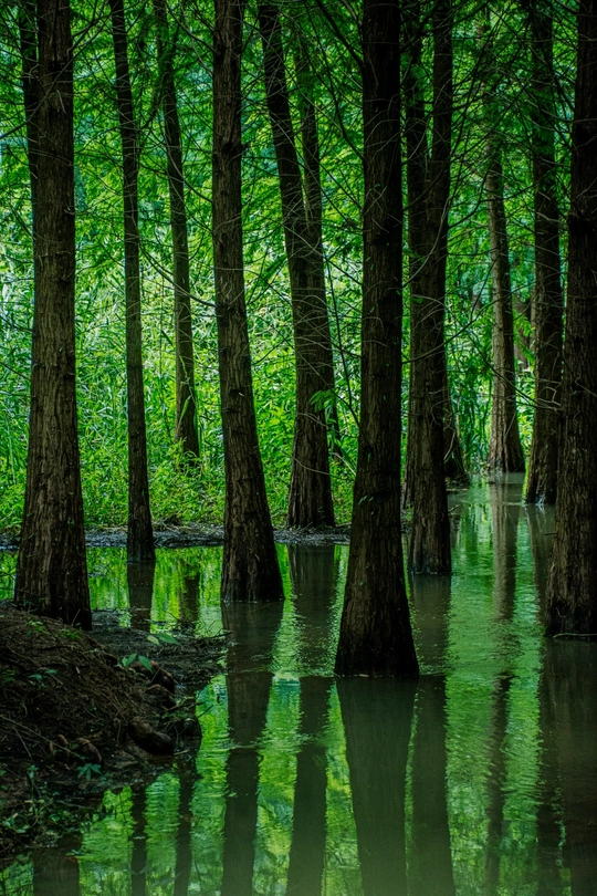 昆明捞鱼河湿地的水上森林,冬季火红的颜色是网红打卡地。但是夏天却是别有一番风味