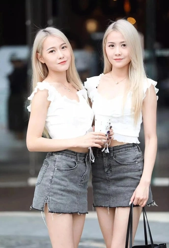 街拍女神:牛仔超短裙的双胞胎姐妹