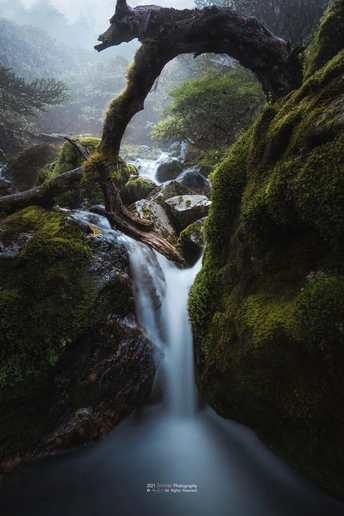 起初,神明与自然共舞,人类在丛林中诞生了最初的记忆。之后,工业革命鸣响着汽笛滚滚而来,遥远的经验成为童话中的想象,一直纠缠于我的脑海。直到我在8月末走进轿子雪山深处,沿着溪流逆流而上,寻到奔涌而下的层层瀑布,苍老的树根和遒劲的枝干,迷蒙的雾气和鲜绿的苔藓……那越过时光的森林,终于第一次出现在我眼前。