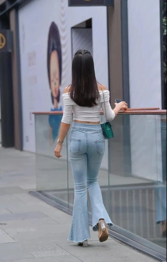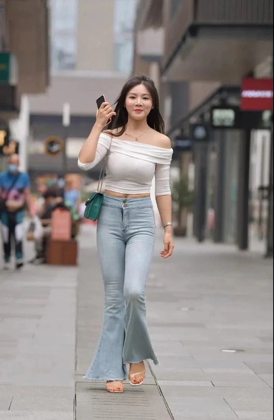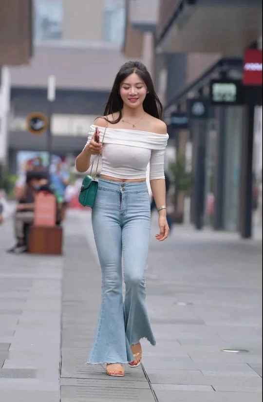 街拍女神:一字肩上衣牛仔阔腿裤时尚女生