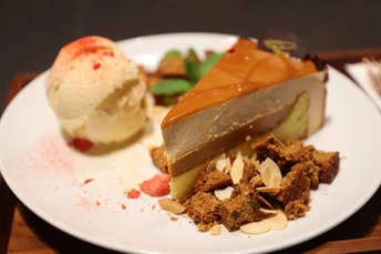 来自上海星巴克臻选烘焙工坊(STARBUCKS RESERVE ROASTERY)的比萨,表皮酥脆,清甜的水果搭配上香嫩的牛肉,一口下去,唇齿留香;搭配上一款下午茶套餐,焦糖蛋糕,表面一层焦糖,中间一层焦糖,入口后些许甜腻,搭配上熟杏仁和现烤面包碎,中和了蛋糕的甜腻;冰激凌球外表圆润,入口奶香四溢,顺滑的口感让每一个味蕾得到了享受;威士忌酒桶咖啡,把星巴克臻选™咖啡豆放入威士忌木桶中发酵,完成后磨粉,冲调,加冰,配上半个小青柠檬,有淡淡的可乐味,较多的还是威士忌的清香