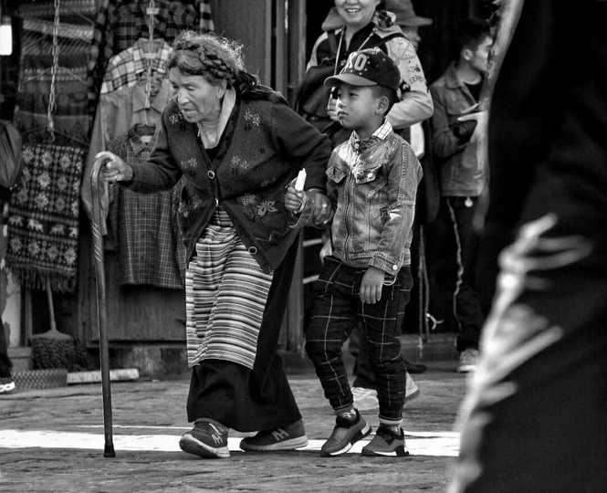 阿婆: 现在是阿婆拉着你走 阿婆帮你祷告愿你后世平安 以后阿婆要是走不动了只能靠你自己了 儿孙: 放心吧阿婆孙辈长大了 会继续为苍生祈福 也要带你一起