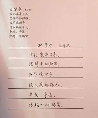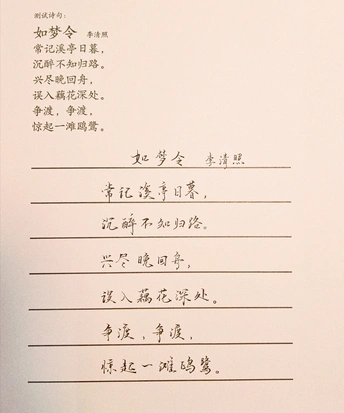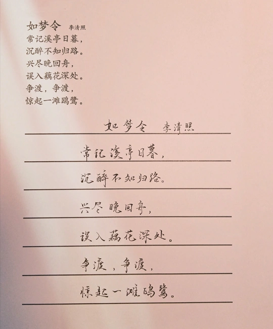 常记溪亭日暮, 沉醉不知归路。 兴尽晚回舟, 误入藕花?深处。 争渡, 争渡, 惊起一滩鸥鹭。