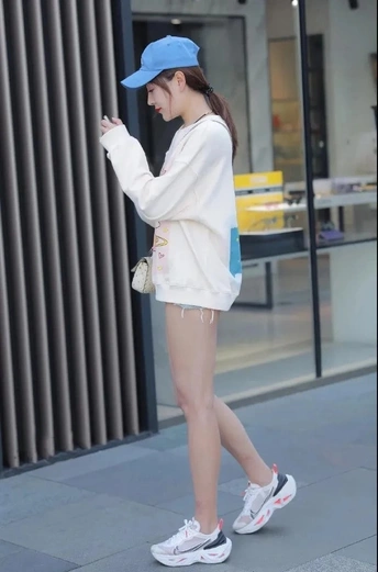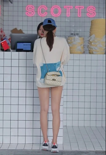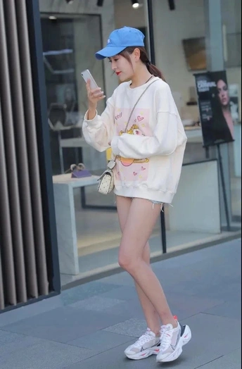 街拍女神:白色卫衣下衣失踪的时尚女生