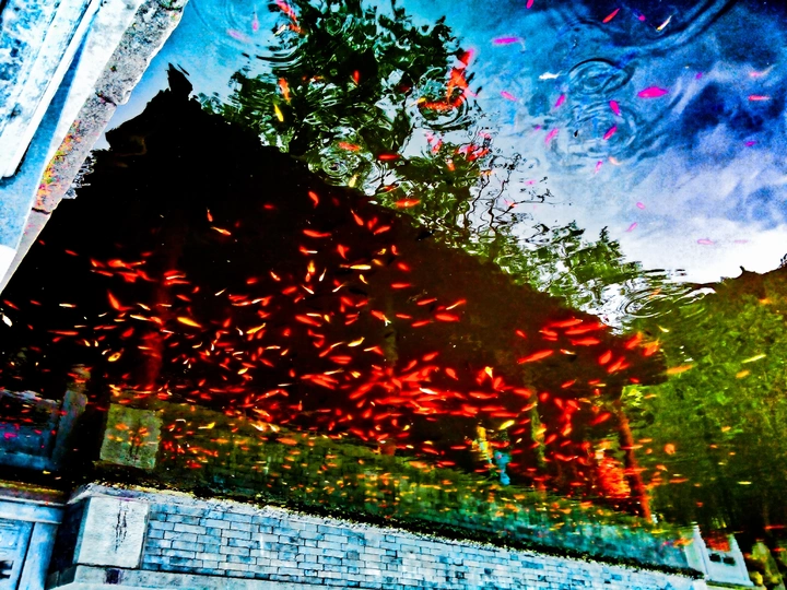 鲤鱼跳龙门,跳过龙门就是龙,飞龙在天,飞得更高!锦鲤戏水,水面反射房屋树和天空云朵,仿佛鱼飞到了天上,奇异壮观!