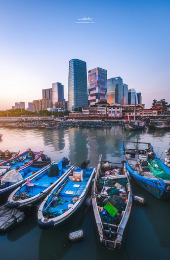 避风坞的小渔船和背后一栋栋拔地而起的商业建筑
