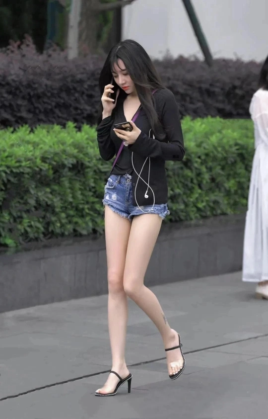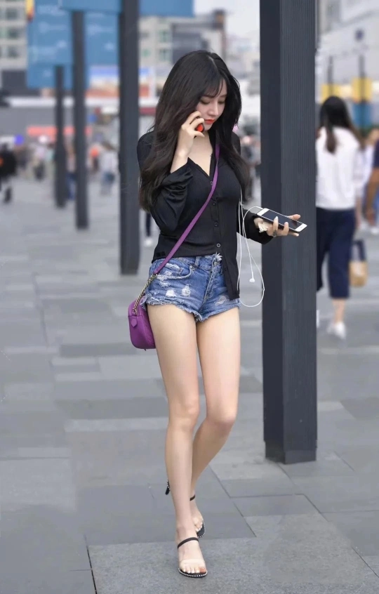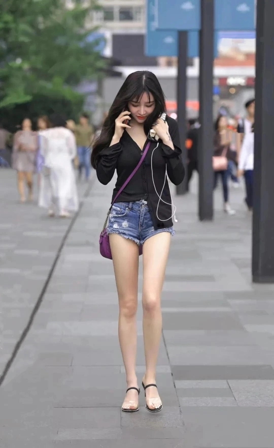 街拍女神:牛仔热裤黑衬衫的时尚女生