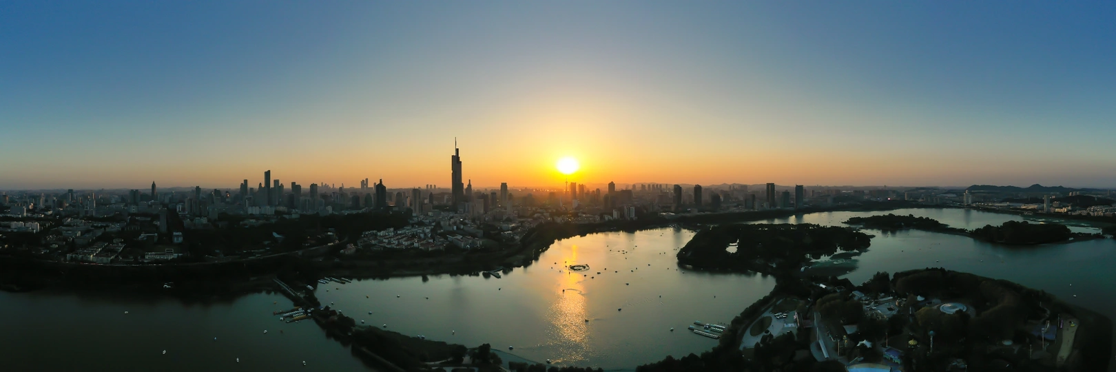 南京地标建筑—紫峰大厦及玄武湖部分傍晚日落瞬间天空的的华美。