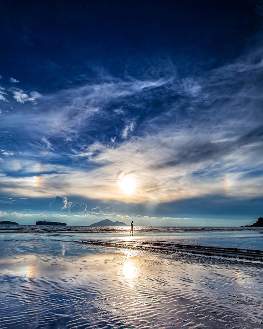 日落西山時,天边泛起幻日美景,刚巧一独行客经过,为画面帶来趣味