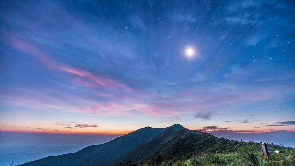 拍摄一个通宵后,天文曙光,月亮,星星,和朝霞得以同时出现在同一个画面。