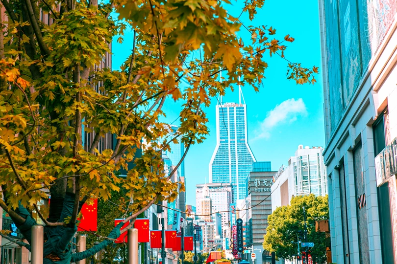 72周年国庆,在上海南京步行街遥望世贸广场,蓝天白云下的旗帜。