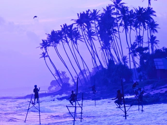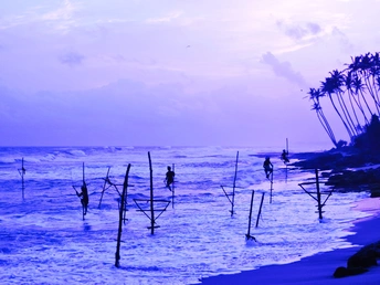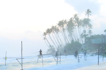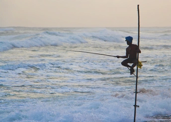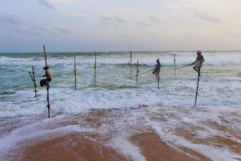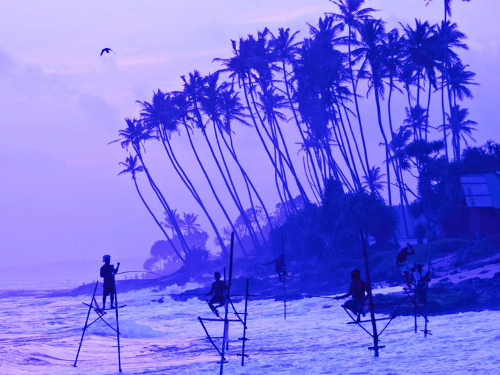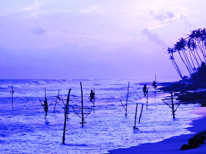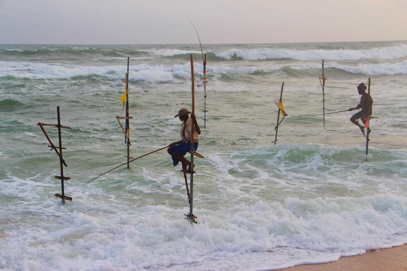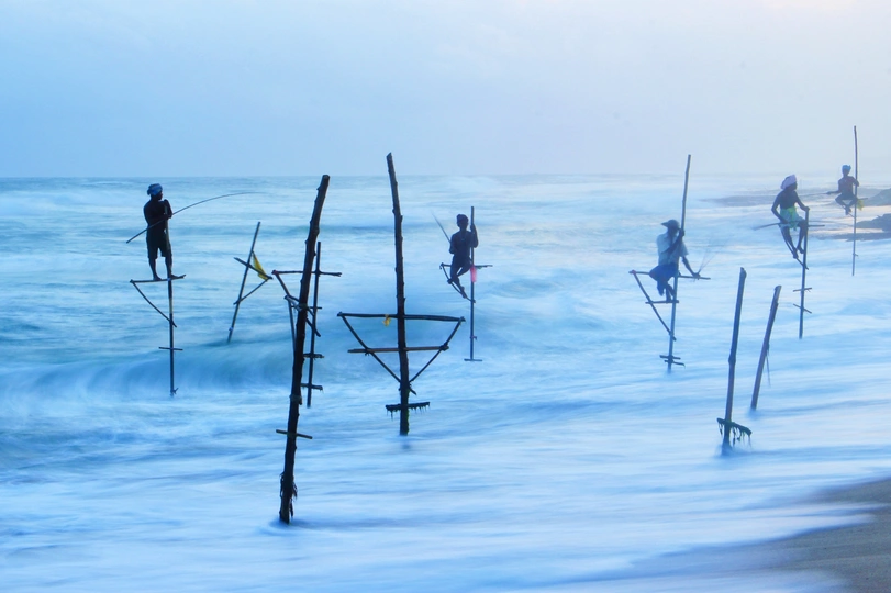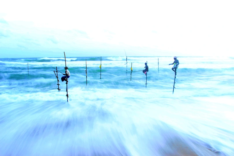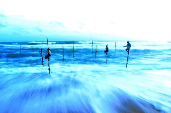 斯里兰卡高跷钓鱼人主要集中在西南海岸的浅海区,从Galle到Mirissa沿岸都可以看到。高跷钓鱼这种当地传统的捕鱼方法被谑称为“世界上最牛钓鱼方式”,渔民基本就是涉水到达浸泡在海水中的木桩那里,爬上去,坐在简陋的木架上,架开鱼竿,目标就是大量游弋在浅海区的沙丁鱼。他们的鱼竿可是没有鱼饵的,所以不得不称奇。据说以前没有钱买船的渔民想出了这个办法,远远看去,好似一群脚踩高跷站立海水中的垂钓者。如此世代相传的技巧,不仅要有良好的平衡能力,要经受海风、日光的双重考验,同时还要密切注意汹涌海水中的猎物,的确不是简单的工作。也难怪成为了如今斯里兰卡的标志性画面之一。 (登围墙摄影于斯里兰卡)