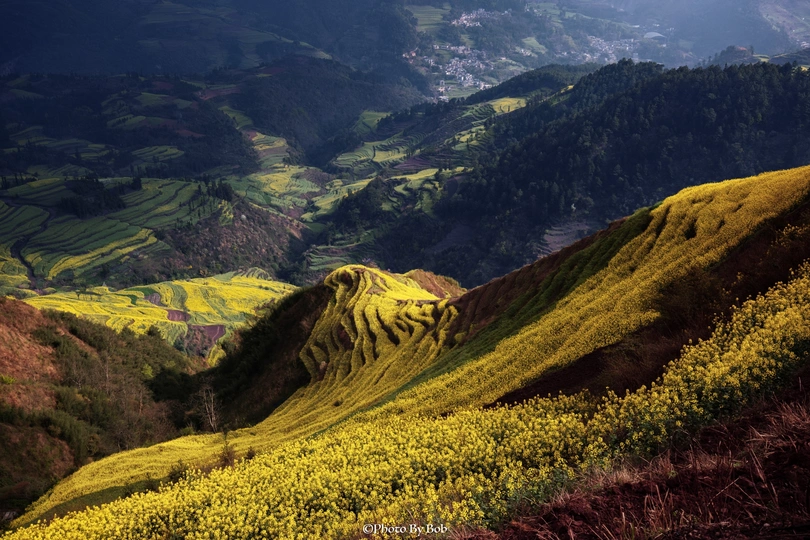 金灿灿的油菜花配上革岗的神奇地形,活脱脱的一只金凤凰