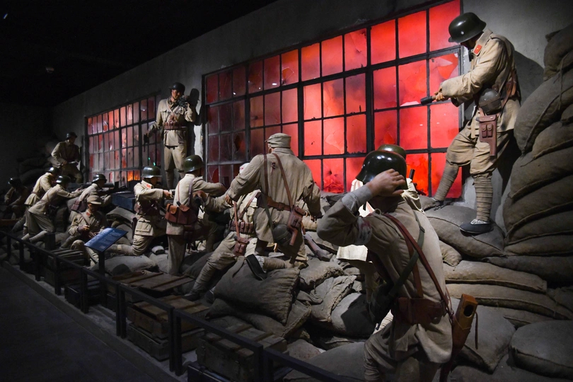 枪林弹雨舞军旗, 铁血丰碑铸迹奇。 赤胆英雄豪气盛, 豺狼络绎命归西。