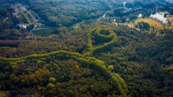 深秋时节,从空中俯瞰,美龄宫恰似项链中心的宝石,而梧桐树圈成的金色链条,在阳光下,在多彩的层林间熠熠生辉……