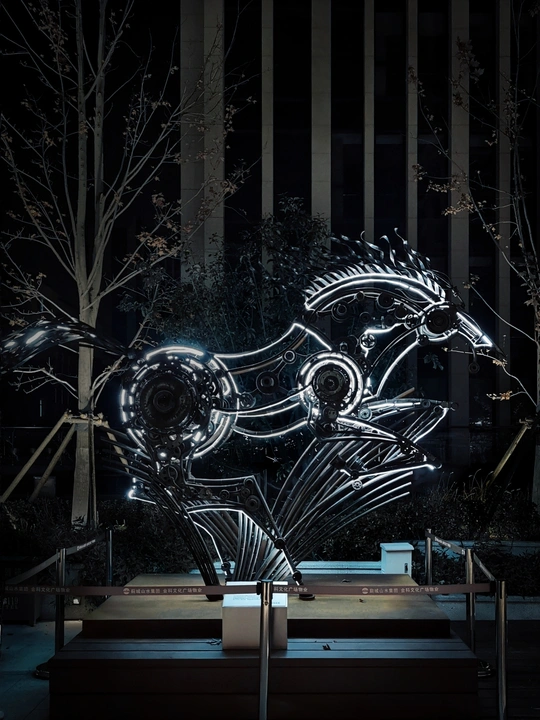 广场上雕塑,白天看起来是金属质感,晚上打上灯光,感觉机械雕塑具有了灵魂,奔跑起来