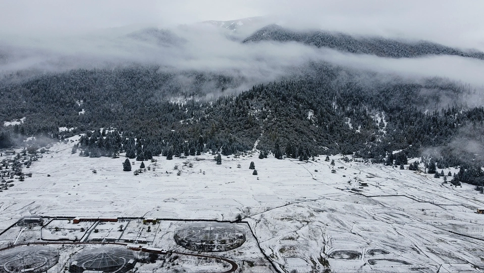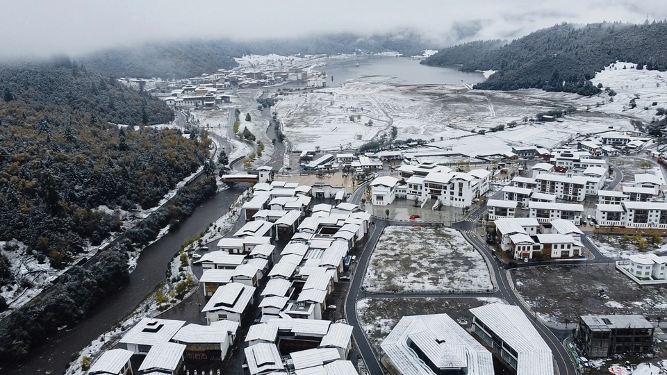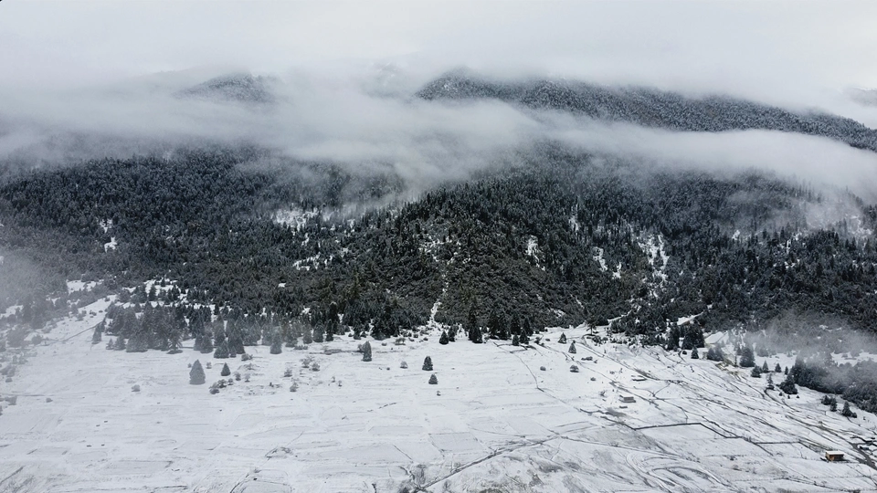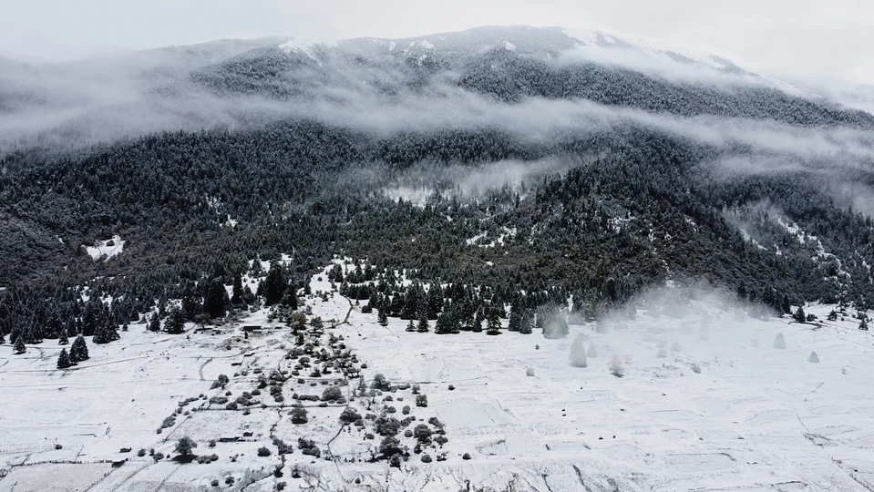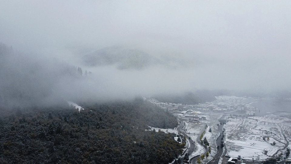 十月份去林芝看秋景 没想到在鲁朗遇见了今年第一场雪 云上是隐约的山尖 云下是批雪的鲁朗小镇 美呆