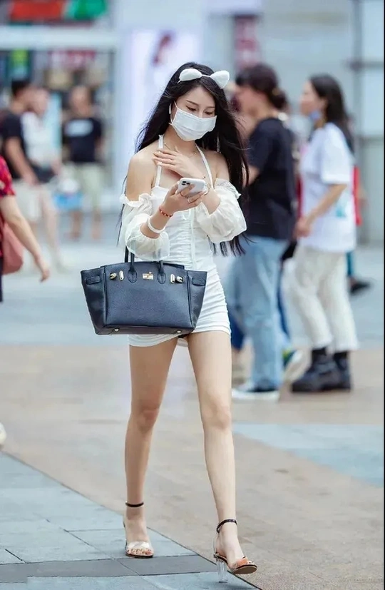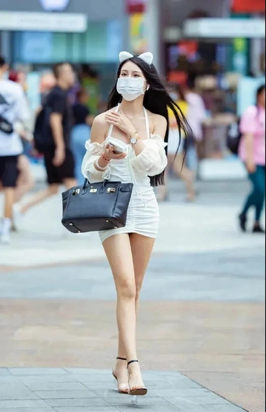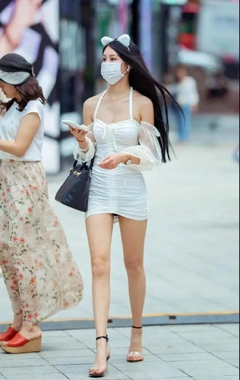 街拍女神:白色吊带超短包臀裙的兽耳女生