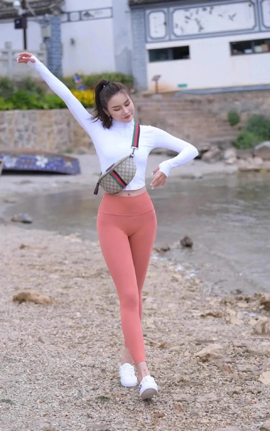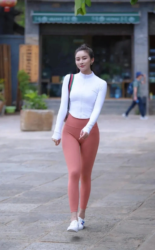 街拍女神:粉色瑜伽裤白色上衣的气质女生