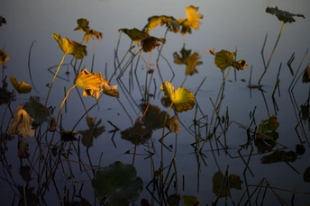 夕阳西下,金色的暖阳撒在干枯的荷叶上,仿佛唤醒了荷花心中的元宇宙。