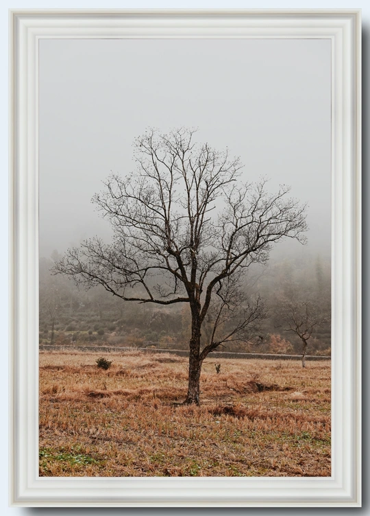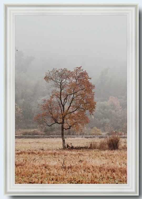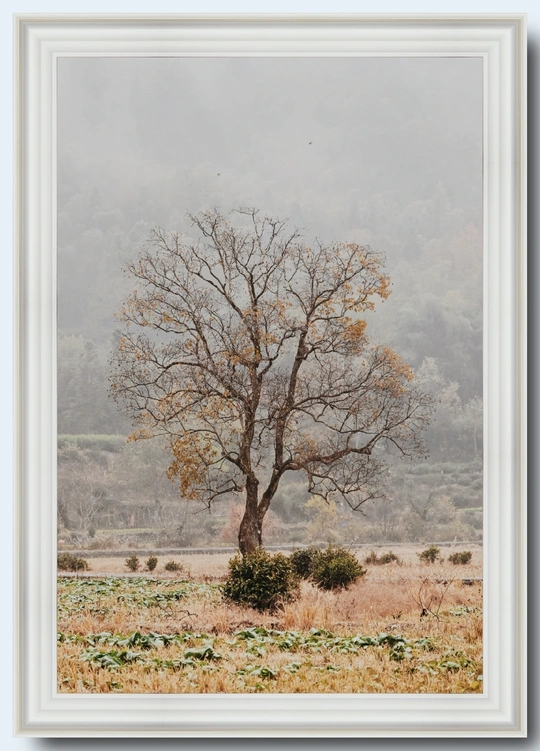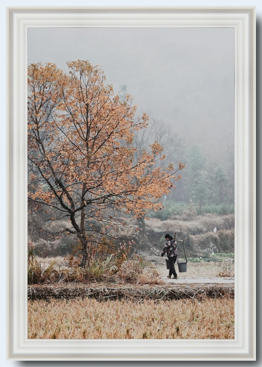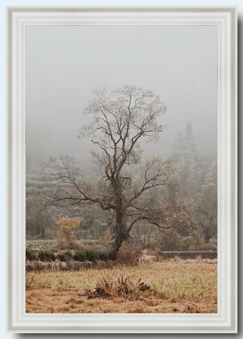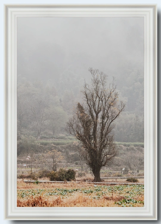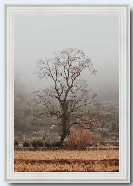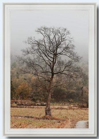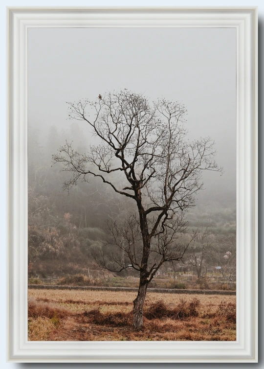 清晨,薄雾中,宏村门前田地里秋冬的树,更显孤寂