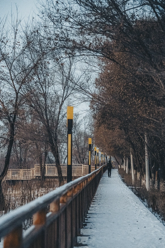 长长的漫步道上,孤独的行人匆匆的走着。呼出的哈气凝结成白色的雾,融入进了初冬的第一场雪中。