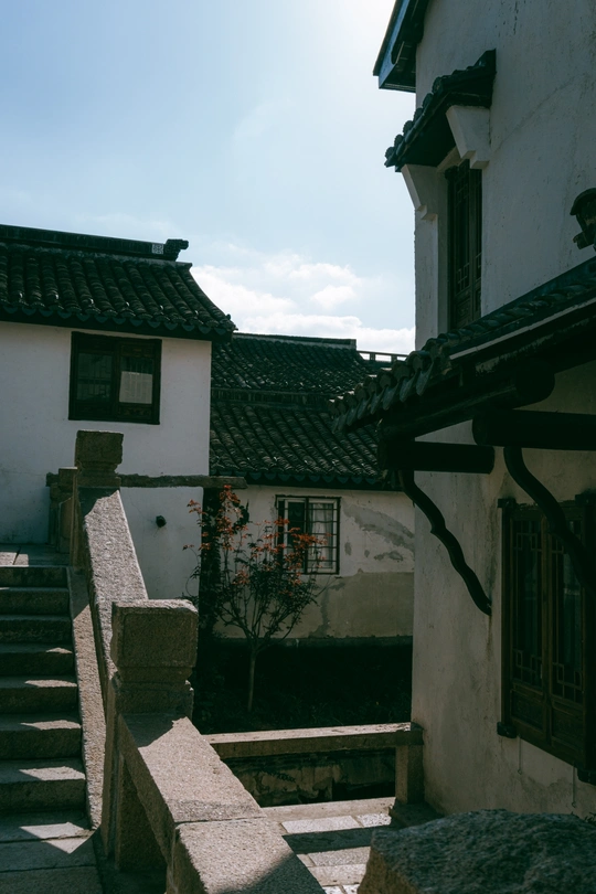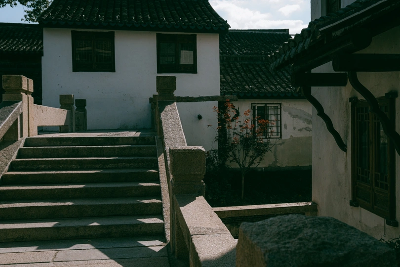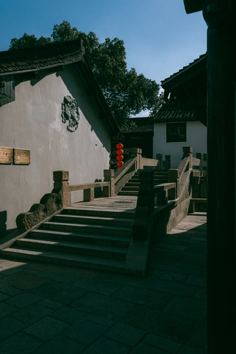 小桥横跨小河两岸, 桥上的石板还略显湿润, 上面结着墨绿的青苔, 细细的露珠散落在上面, 清晨的微光荡漾在桥上, 如仙歌般的世外桃源。