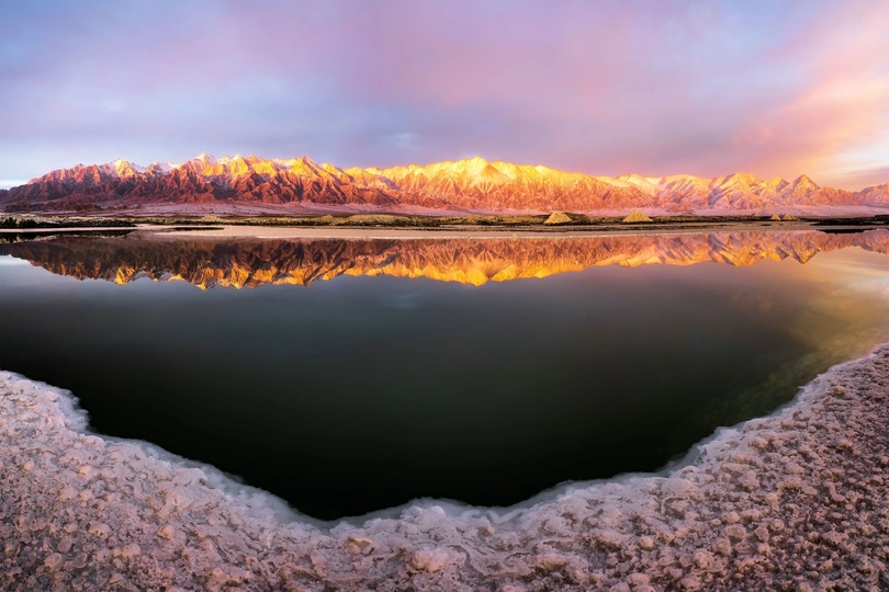日照金山倒映在翡翠湖 现在应该是#大柴旦翡翠湖 最美的季节吧 #柴达木