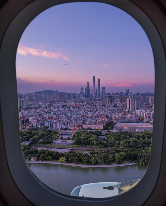 📷机位:这个海珠湖的经典机位,大多数摄影博主都有打卡过,这个机位可以把广州塔、东塔和西塔横跨着拍进去。 ⏰时间段:最好下午4、5点钟的时候去到那里第一是没这么晒 第二可以可以拍到整个光影变化,可以拍日转夜延时视频,可以等6点多太阳落下去的蓝调时刻日落🌄夕阳,拍出来直出都很好看,现在这张就是在蓝调时刻拍的,绝美! 💻修图:色温偏冷了一点,色调往洋红色调,飞机窗户是后期加的。
