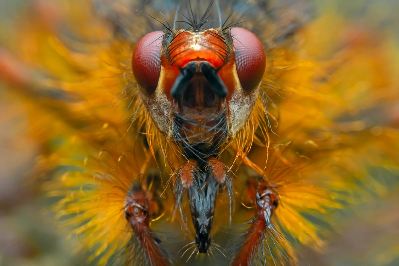 白马雪山上一只在绿绒蒿花朵上爬来爬去的毛绒绒的苍蝇。