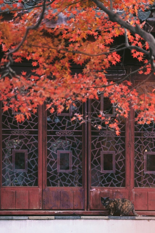这是留园的玳瑁猫“阿杂”,是“阿花”的女儿。她独霸一方红枫,快哉!