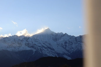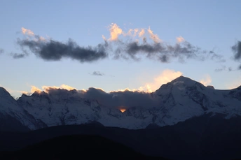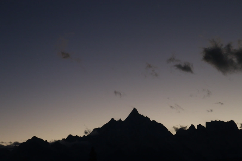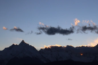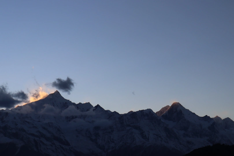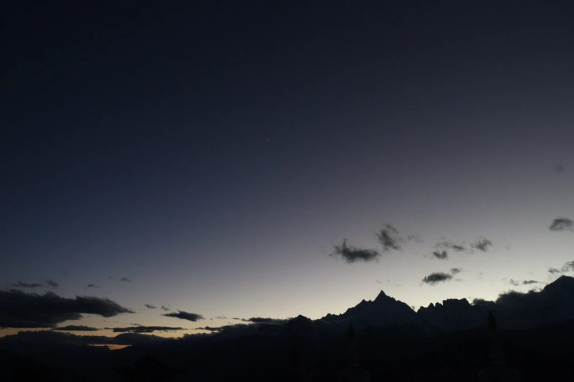 梅里雪山的黄昏,落日余晖与云的配合,让梅里雪山像在冒烟