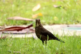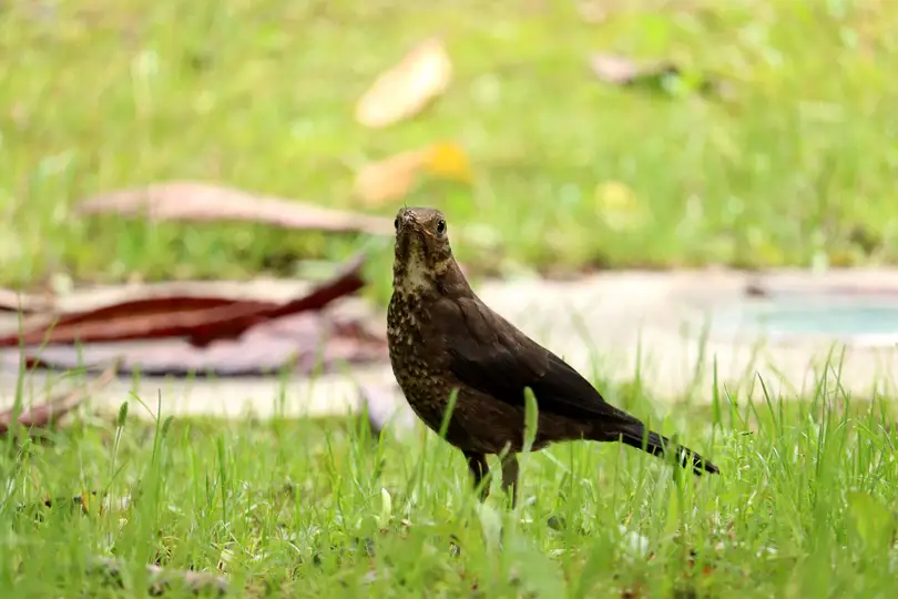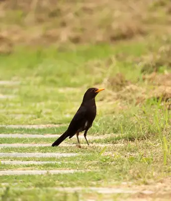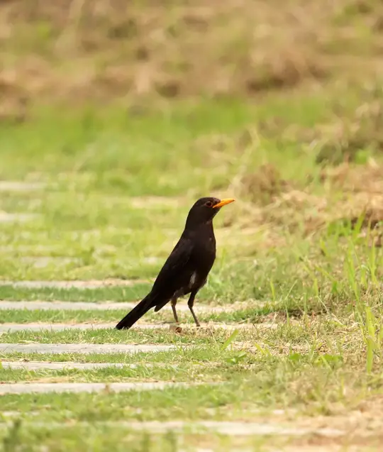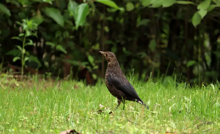 草地上觅食的乌鸫鸟。