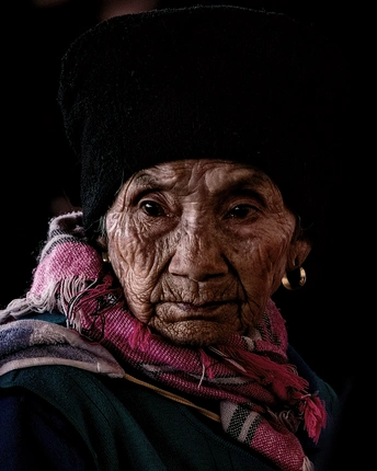 拥有幸福人生的百岁高龄老妇,脸上写满岁月的痕迹,见证百年沧桑巨变的双眼依旧炯炯有神。