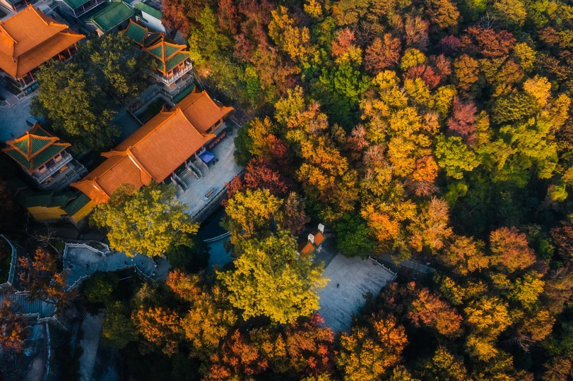 江门新会圭峰山玉台寺枫林航拍,南方城市的冬天彩林。