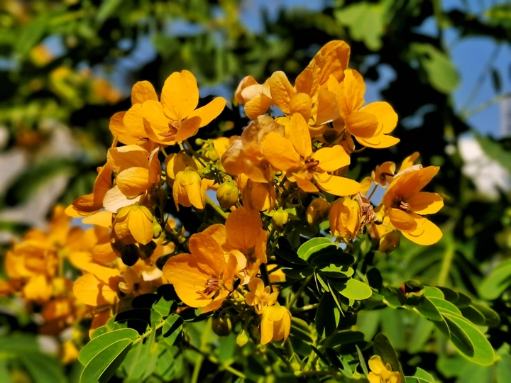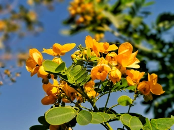 灌木或小乔木,高5-7米;分枝多,小枝有肋条;树皮颇光滑,灰褐色;小叶7-9对,长椭圆形或卵形,下面粉白色,被疏散、紧贴的长柔毛,边全缘。总状花序生于枝条上部的叶腋内;苞片卵状长圆形,外被微柔毛,萼片卵圆形,大小不等;花瓣鲜黄至深黄色,卵形至倒卵形,长1.5-2厘米;雄蕊10枚,全部能育。荚果扁平,带状,开裂;种子10-12颗,有光泽。花果期几全年。