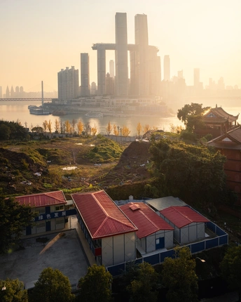 夕阳下的来福士与工地板房
