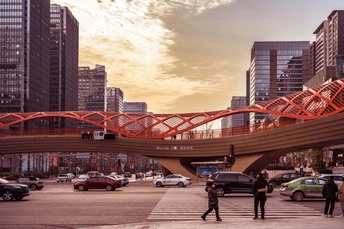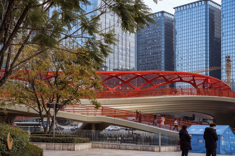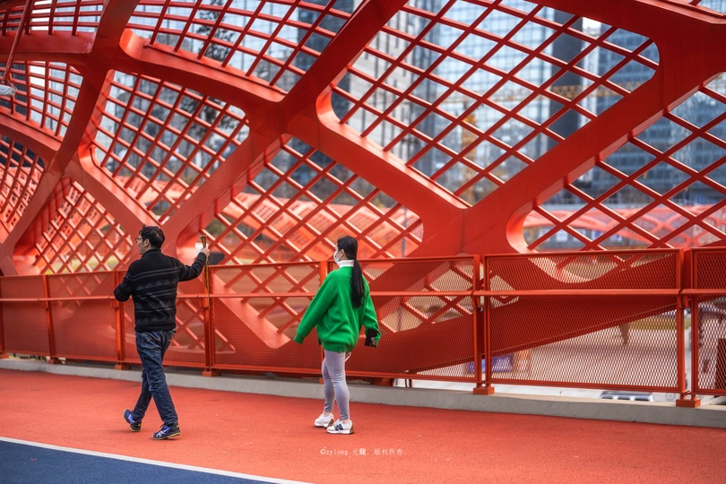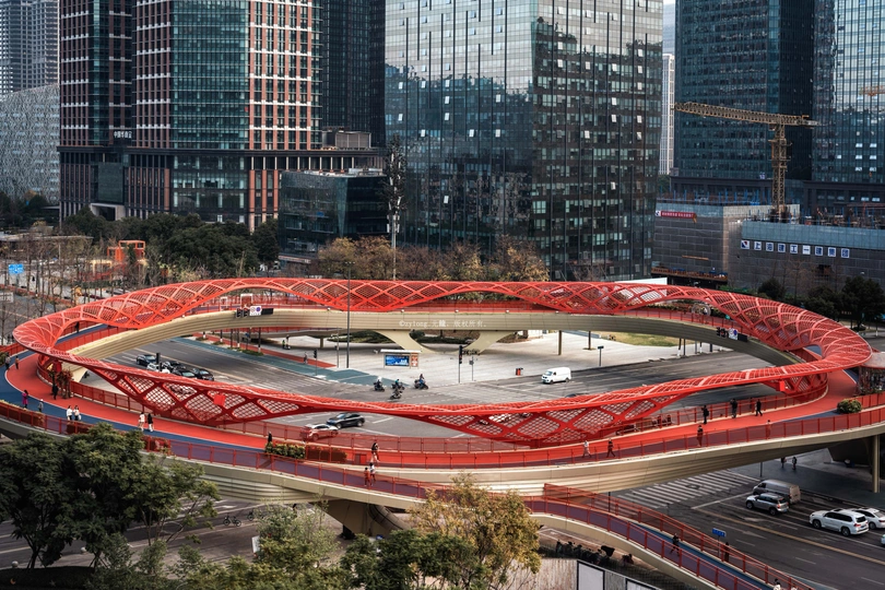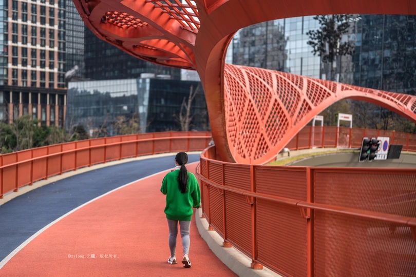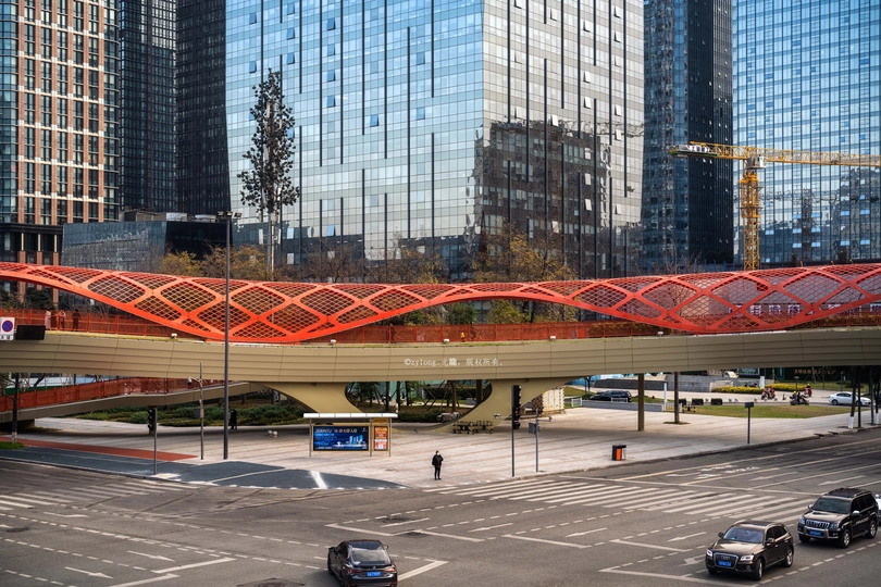 这是一座位于四川成都益州大道和交子大道十字路口的过街人行天桥,是一座景观桥梁。整座桥梁以古代交子纸币为设计原型,呈环状连接起整个十字路口。桥梁由风雨环廊、交通环、结构环三部分构成,其中风雨环廊和结构环为外观主题色彩载体,搭配在一起特别好看,如今这里已成为市民的打卡热衷地了……